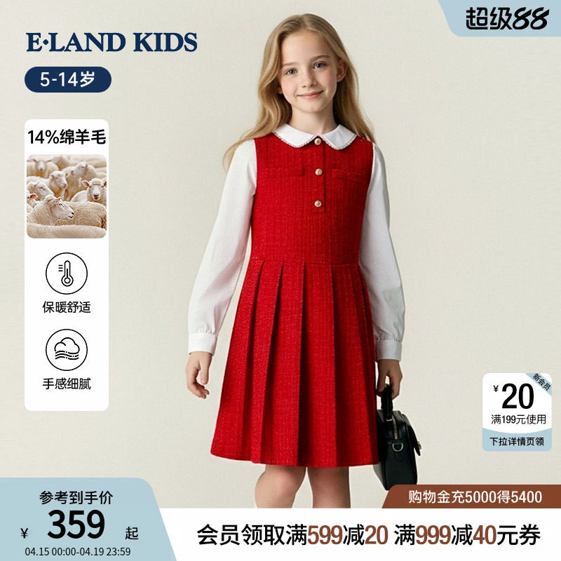 【14%绵羊毛】eland kids衣恋童装女童连衣裙秋冬红色小香风裙子