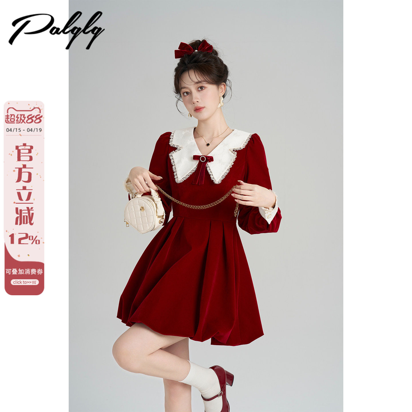 Palglg圣诞娃娃领红色丝绒连衣裙女冬季高级感小香风收腰花苞短裙