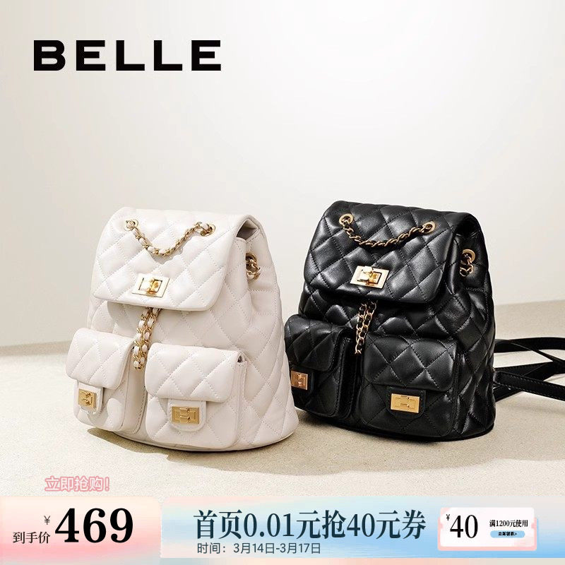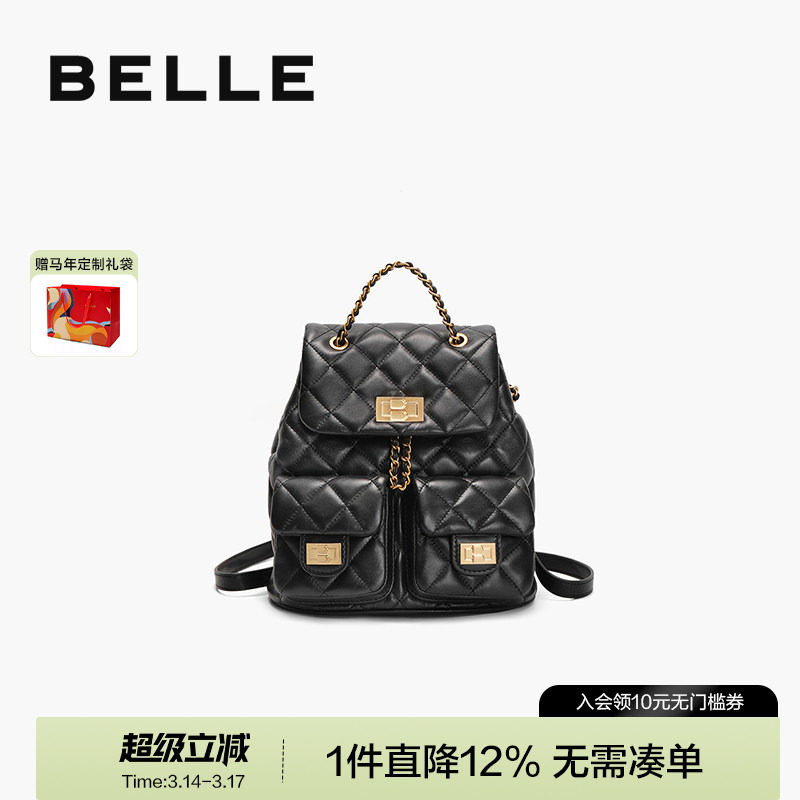 百丽包包女新款真皮小香风背包菱格链条通勤双肩包书包X9330BX4