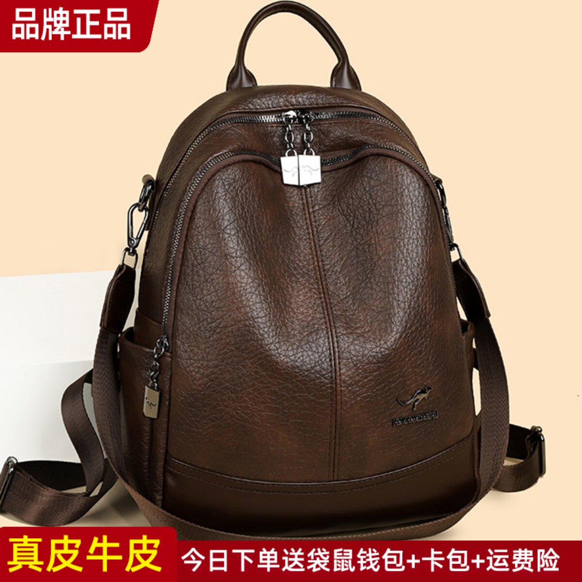品牌袋鼠真皮双肩包女2026新款旅行背包大容量双肩包轻便双肩背包