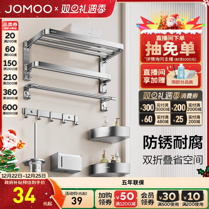 九牧官方卫浴浴巾架卫生间置物架免打孔太空铝浴室挂件套装毛巾杆