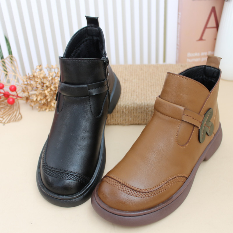 平底短靴子女秋冬季软底舒适矮靴中年妈妈鞋子加绒二棉鞋真皮女鞋