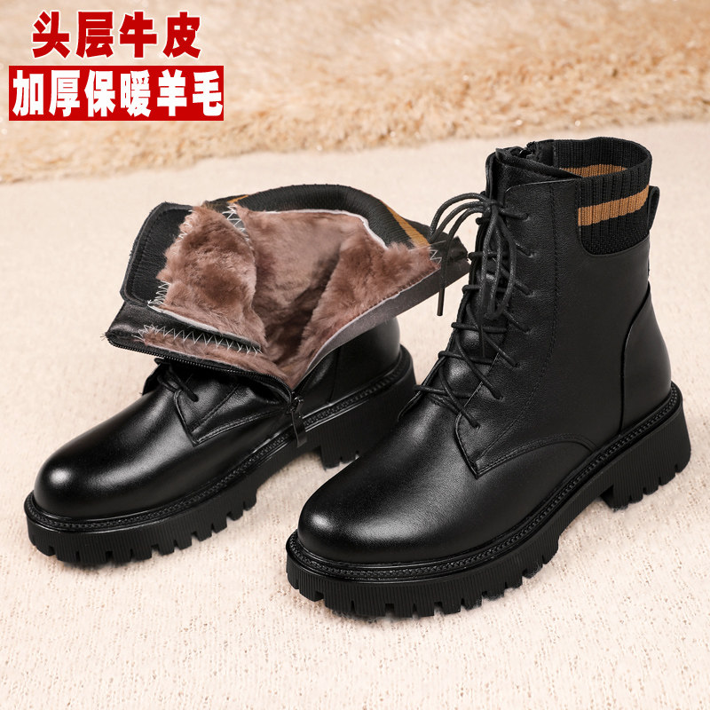 真皮马丁靴女英伦风粗跟短靴高跟厚底加绒妈妈棉鞋中跟羊毛棉靴冬