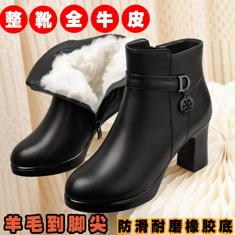 冬季真皮女靴高跟鞋女短靴中年羊毛棉鞋加绒保暖棉靴妈妈鞋棉皮鞋