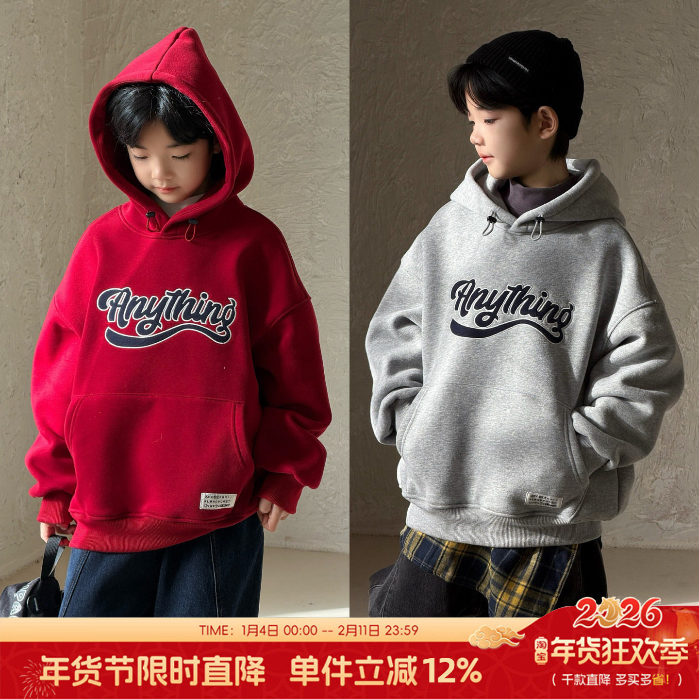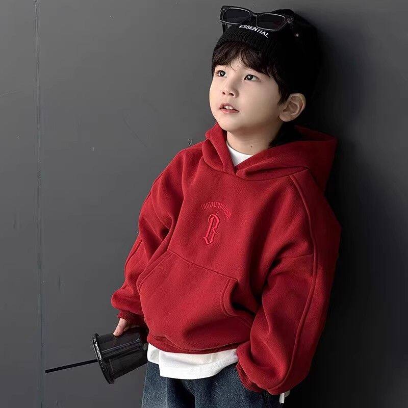 新年衣男童加绒红色卫衣秋冬2025新款连帽衫儿童加厚套头衫上衣