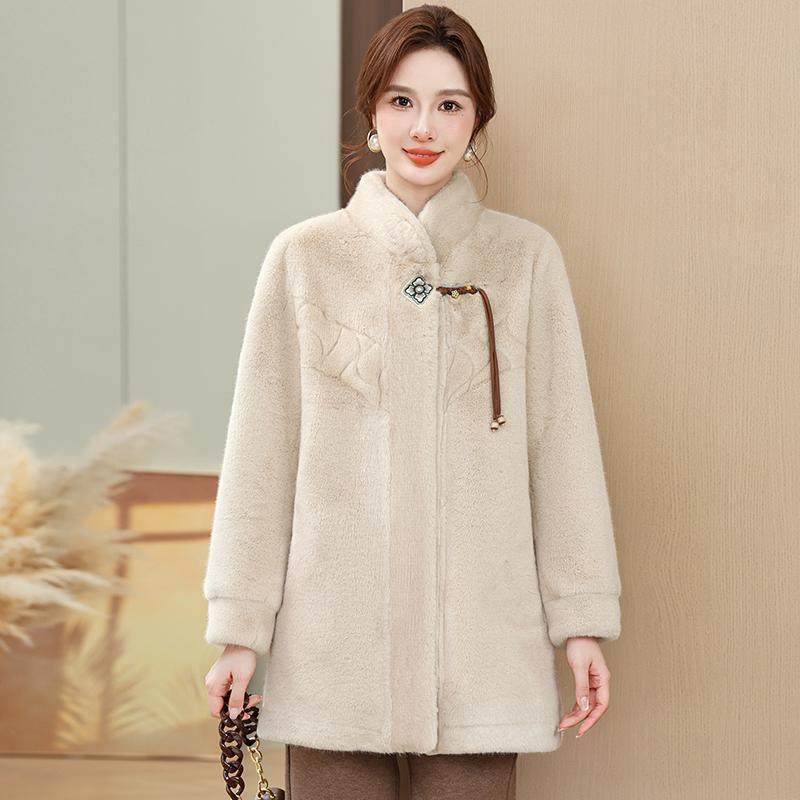 皮毛一体羊羔绒外套女秋冬季新款加绒加厚妈妈装中长款颗粒绒大衣