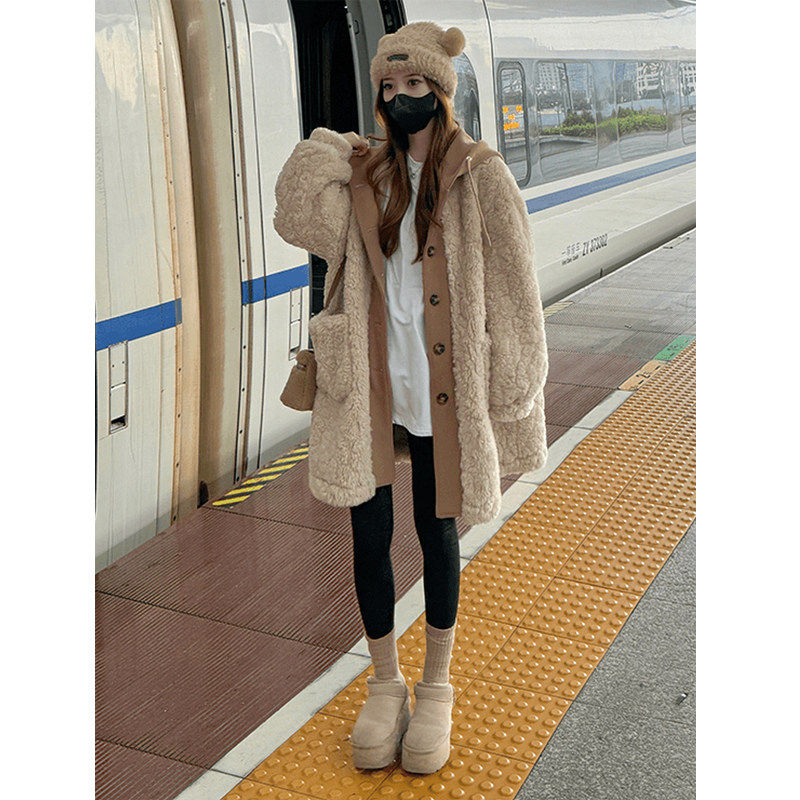 慕兔甜美仿羊羔毛连帽外套女2025冬季新款加厚中长款皮毛一体大衣