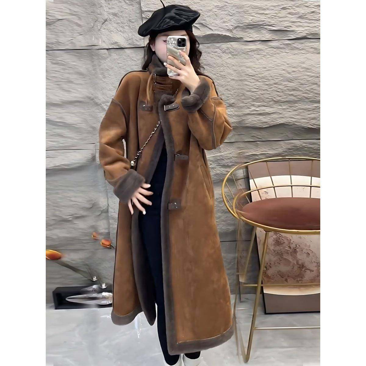 2025秋冬季新款复古风羊羔毛外套女牛角扣皮草中长款皮毛一体大衣