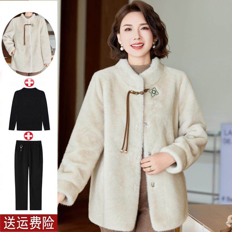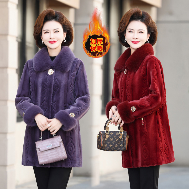 妈妈冬装水貂绒皮草外套女毛呢上衣中老年冬季中长款皮毛一体大衣