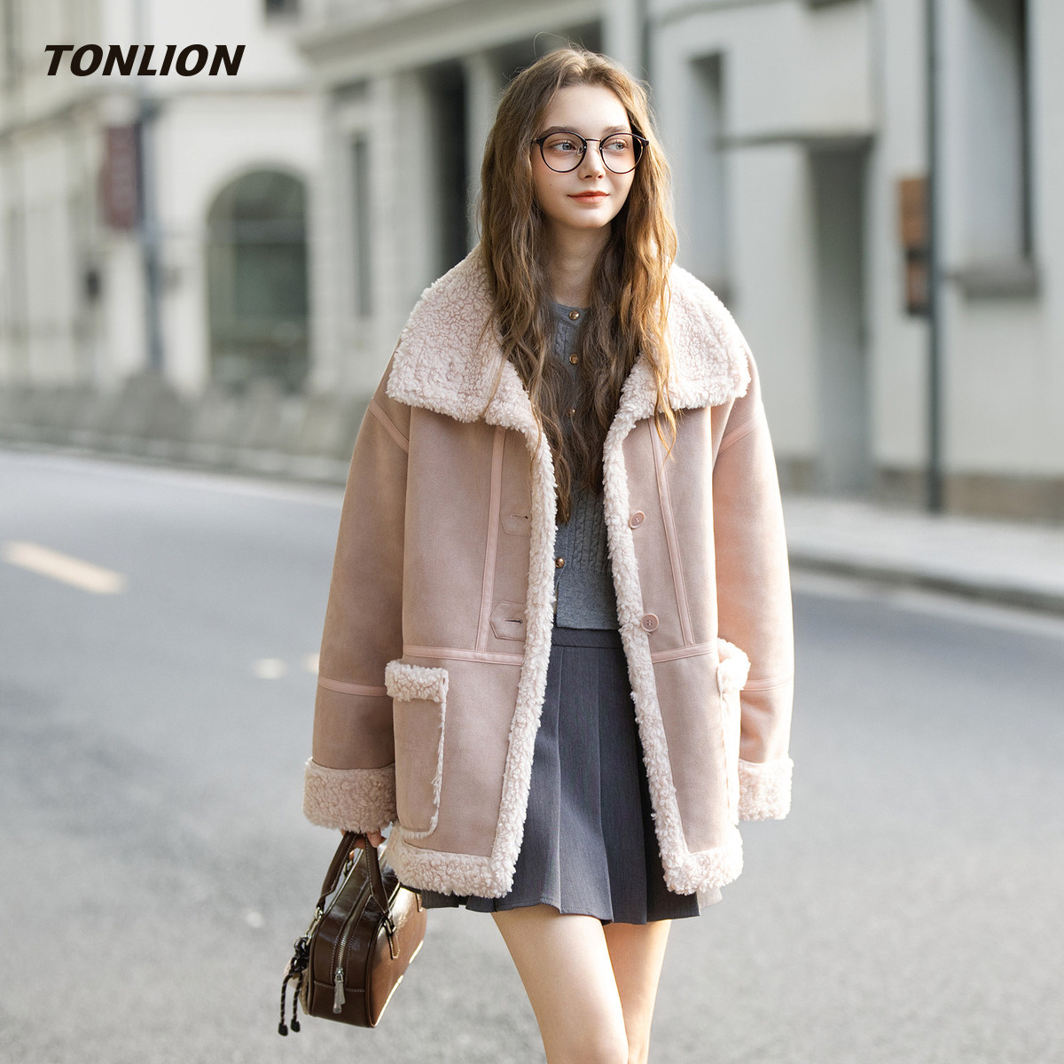 唐狮仿羊羔毛外套女2025冬季新款撞色翻领宽松中长款皮毛一体大衣