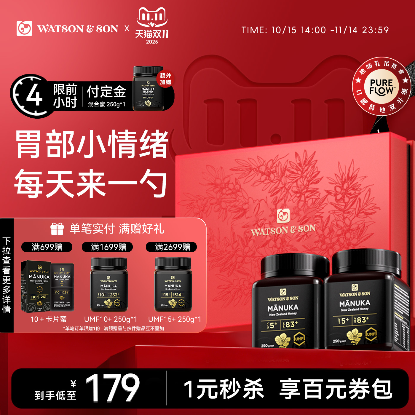 沃森父子新西兰麦卢卡蜂蜜UMF5+10+15+20+250g高端礼盒2瓶送长辈