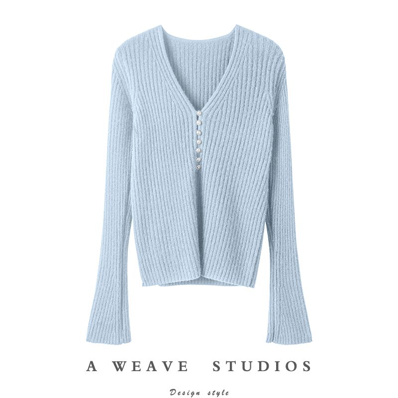 舒适再升级~简约好穿珍珠扣V领喇叭袖纯羊绒针织开衫女秋冬毛衣