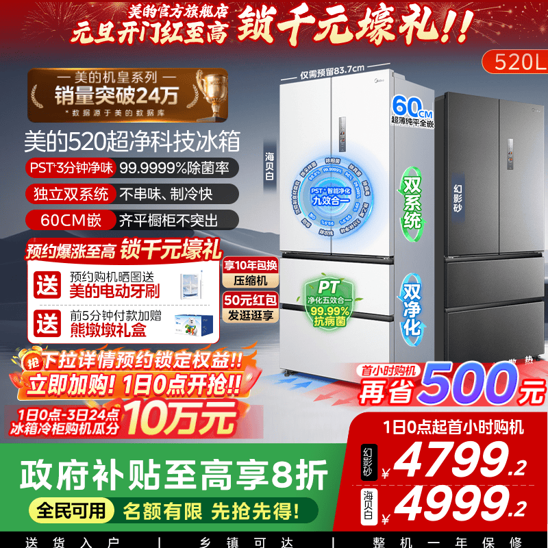 美菱双系统零嵌冰箱511L法式多门一级家用主动除菌以旧换新补贴