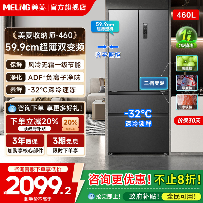 美菱收纳师460L法式多门超薄嵌入式冰箱家用变频一级换新补贴20%