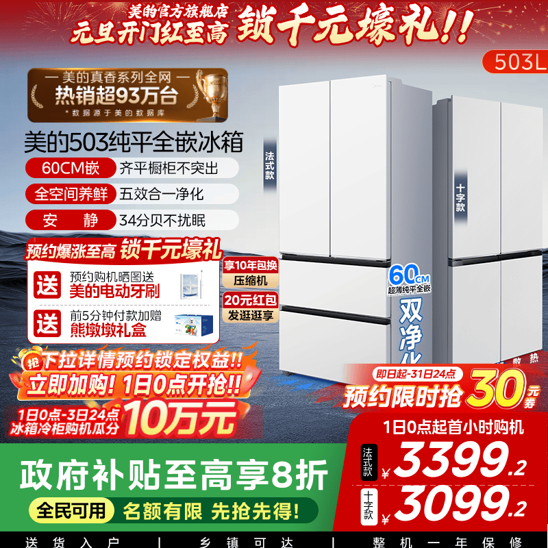 新品美的503零嵌入式冰箱家用法式多门十字双开四门风冷无霜一级