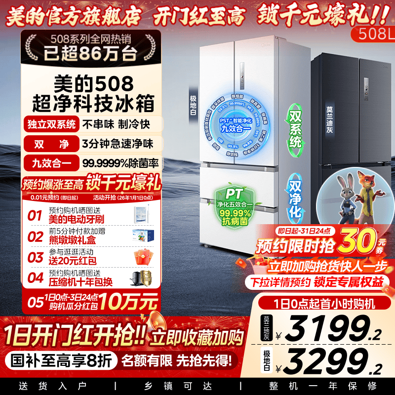【双系统】美的508法式双循环多门四门净味无霜大容量家用冰箱