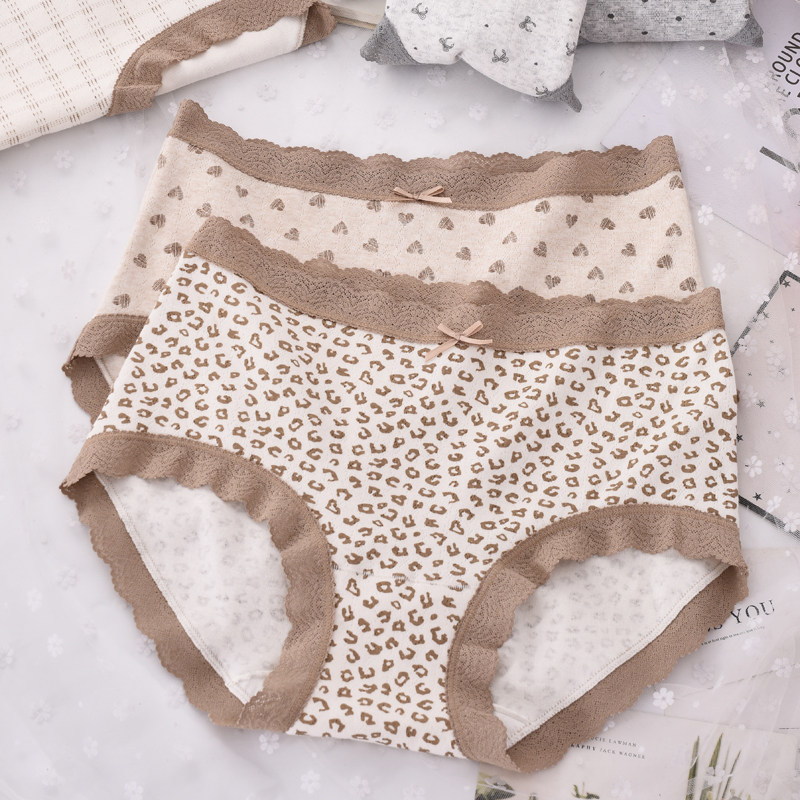 纯棉豹纹内裤女中腰棉质面料蕾丝边爱心大码胖MM包臀三角裤衩头