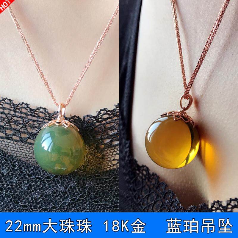 天然墨西哥蓝珀大吊坠22mm圆珠琥珀项链蜜蜡圆珠18k金生日礼物