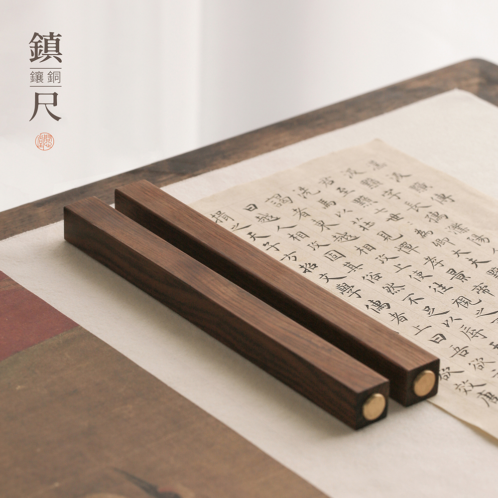 正方素雅镇尺定制刻字黑檀木镇尺实木镇纸书法压纸镇尺书法镇纸黄铜实木中国风毛笔压纸嵌铜檀香如意镶铜文房