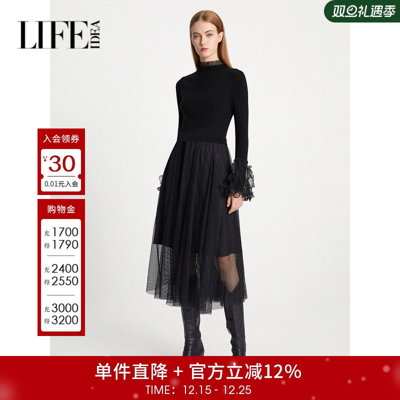 莱芙艾迪儿品牌女装拼接设计感长袖针织气质高腰连衣裙1D4M40269