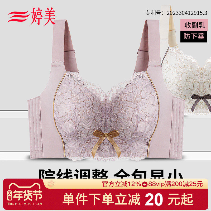 婷美院线款大胸显小内衣女无钢圈调整型防下垂快速收副乳大码文胸