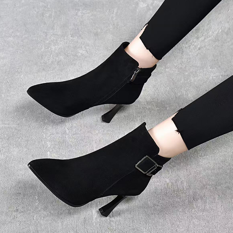 黑色高跟鞋女2025新款尖头羊猄绒水钻方扣百搭细跟软底单鞋配裙子
