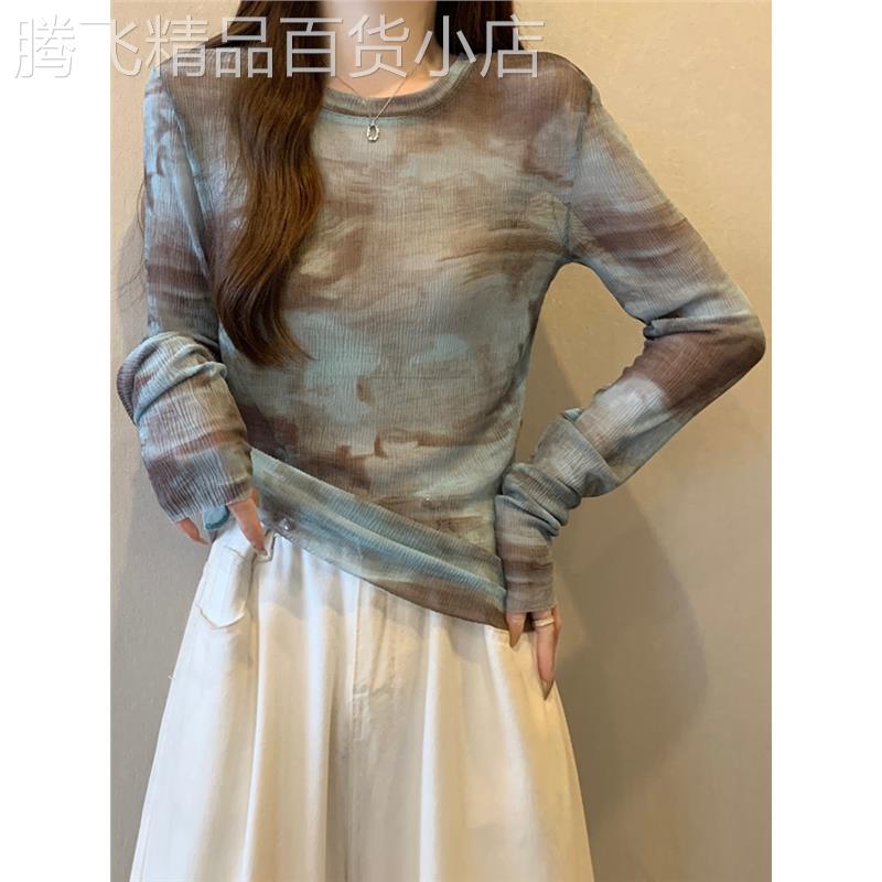 圆领扎染长袖防晒冰丝针织上衣女春秋季欧货薄款收腰复古套头罩衫