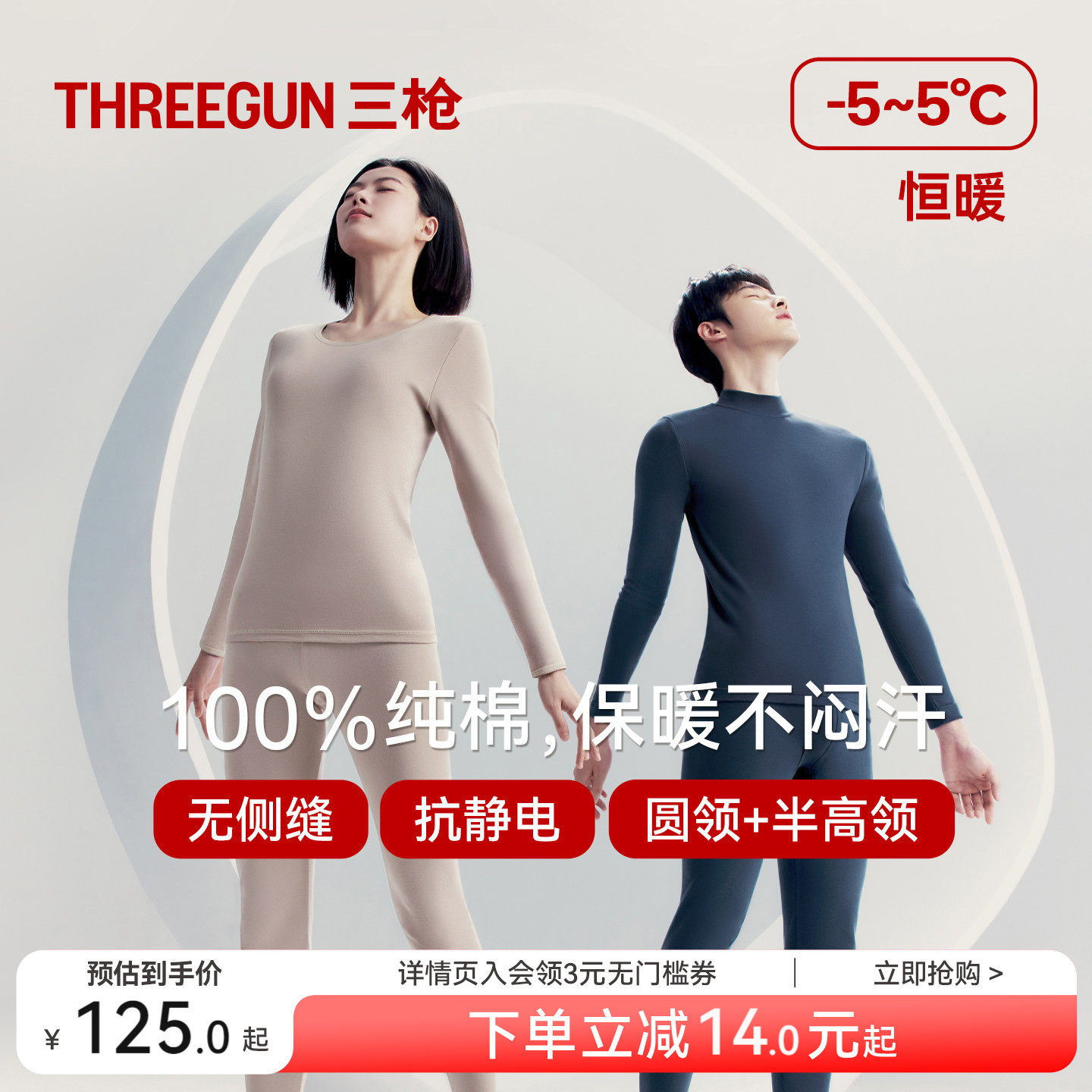 三枪保暖内衣男纯棉中厚秋衣秋裤套装女圆领抗静电半高领棉毛衫裤