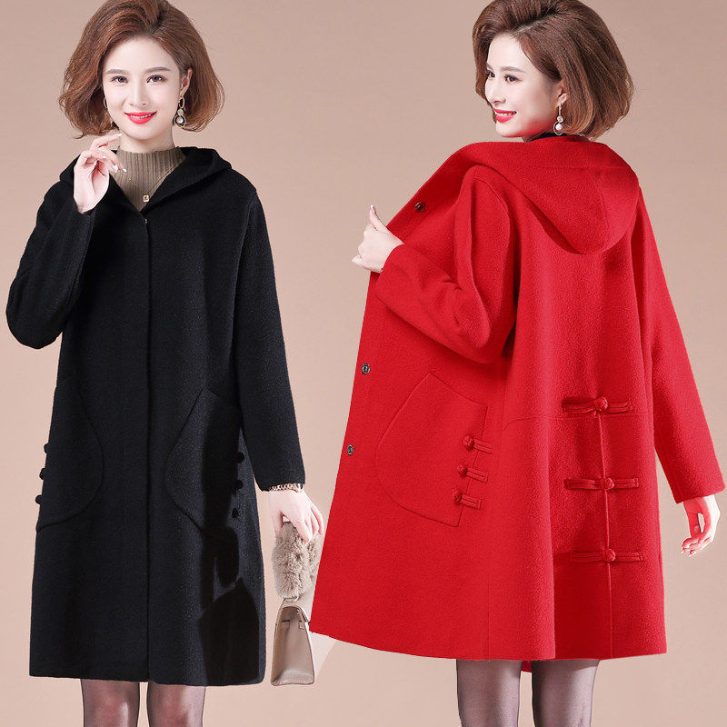 高贵妈妈秋冬双面羊绒大衣中年女加肥加大码连帽毛呢子外套中长款