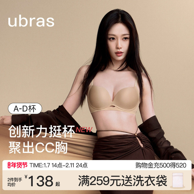 虞书欣同款ubras力挺杯小胸聚拢无痕收副乳调整红色文胸罩内衣女