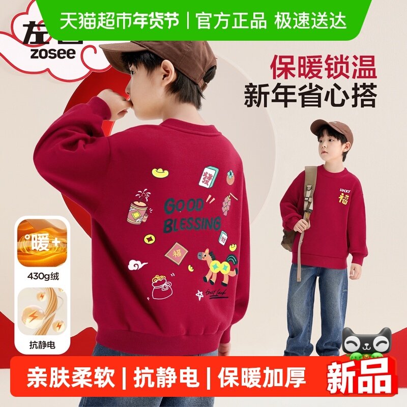 左西童装男童红色加绒卫衣2025秋冬新款马年本命年保暖加厚冬外套
