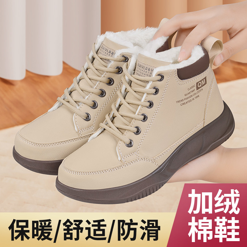 老北京布鞋女加绒加厚冬季保暖毛绒内里软底舒适皮面防滑妈妈棉鞋