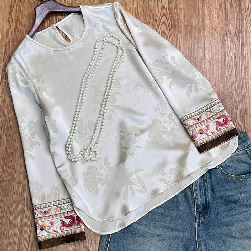 新中式国风缎面刺绣衬衫女春秋气质长袖提花小衫显瘦改良唐装上衣