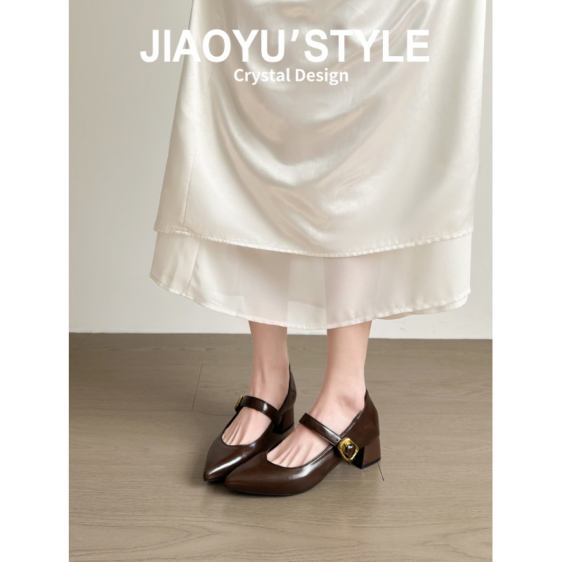 真皮~骄屿棕色复古尖头玛丽珍女鞋浅口一字带通勤单鞋气质高跟鞋