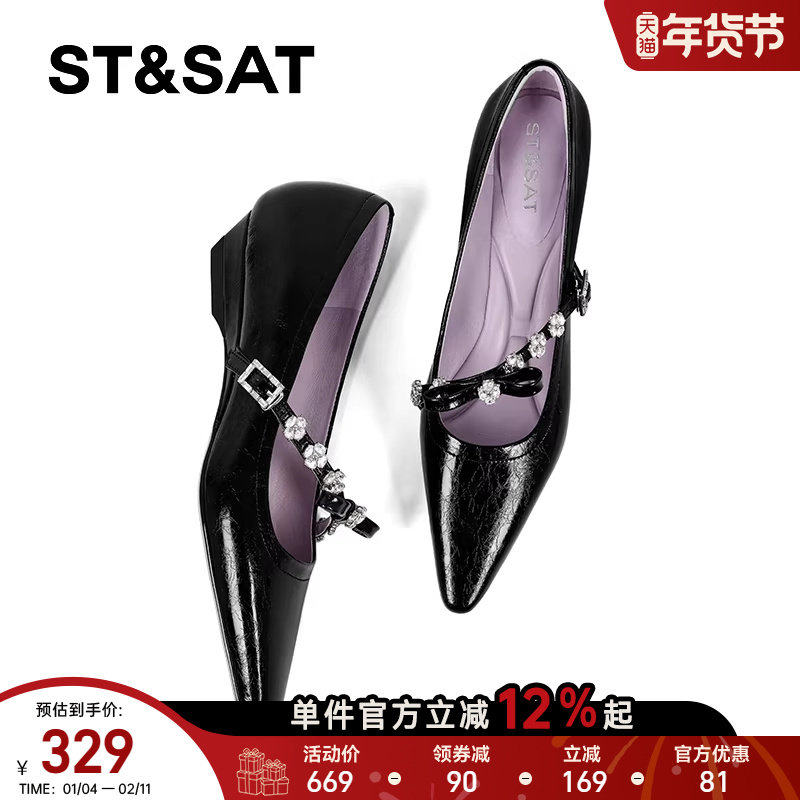 星期六2025春秋季尖头浅口单鞋女真皮水钻低跟法式玛丽珍气质女鞋