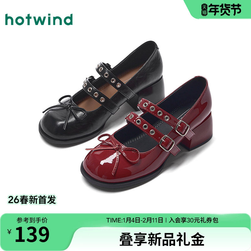 热风粗跟玛丽珍鞋女2026年春季新款蝴蝶结浅口单鞋百搭配裙子女鞋