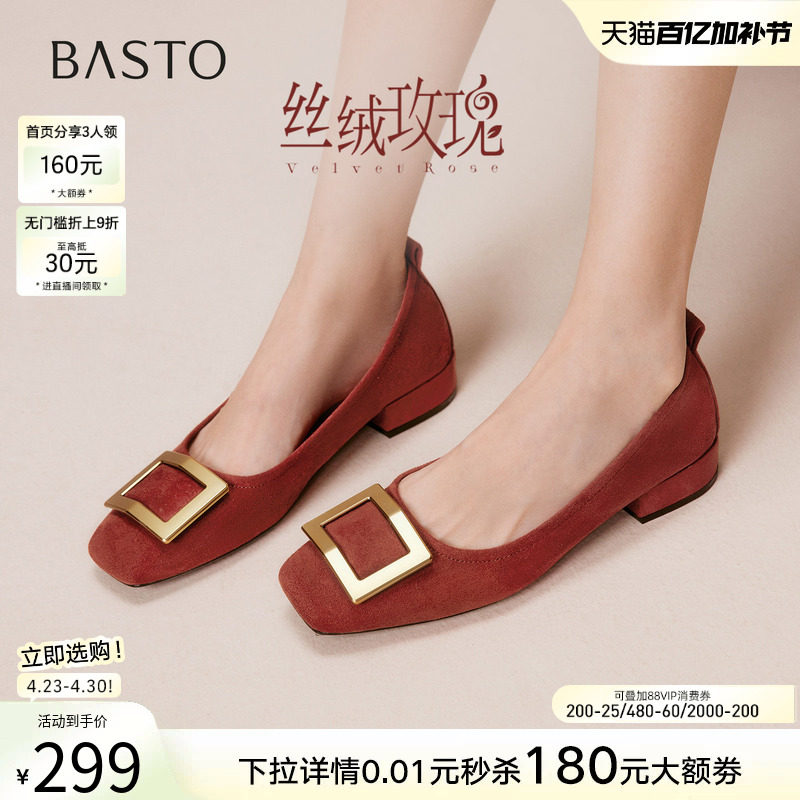 【丝绒玫瑰】百思图26春新款方扣红色单鞋高跟粗跟浅口女平底婚鞋