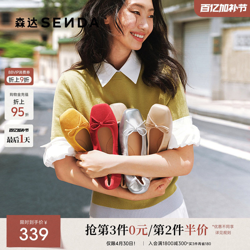 森达羊皮蛋卷鞋女银色皮鞋平底鞋浅口芭蕾鞋红色玛丽珍法式单鞋女