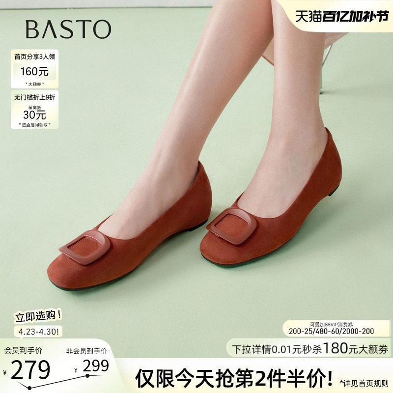 百思图26春季新款红色芭蕾单鞋绒面浅口蛋卷鞋平底女布鞋B2700CQ5