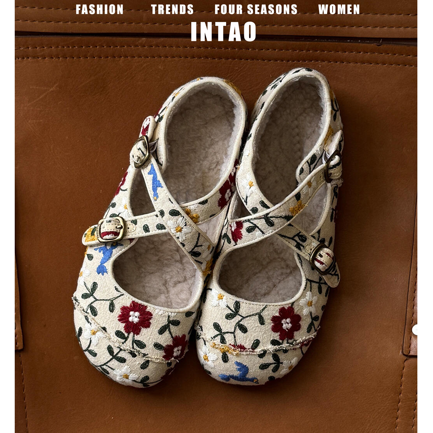 设计感小众刺绣玛丽珍毛毛鞋女加绒平底棉鞋懒人交叉扣带豆豆单鞋