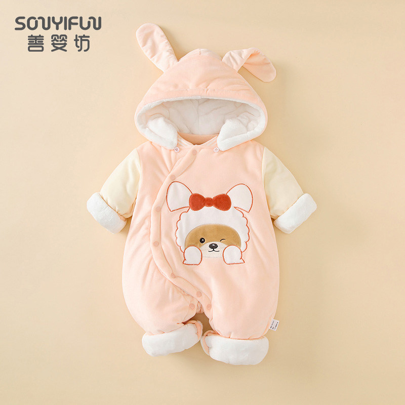 冬季婴儿哈衣加绒厚夹棉女新生儿宝宝可爱时髦外出抱衣棉衣连体衣