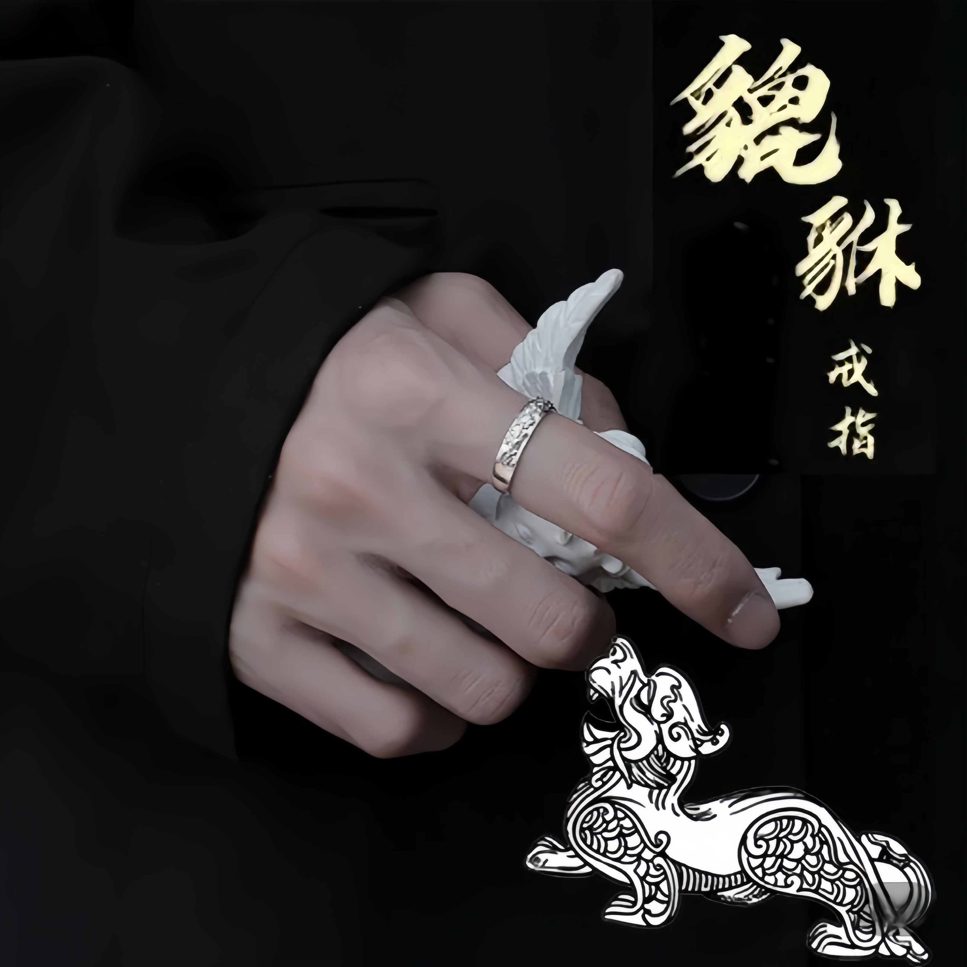 国风复古招财貔貅戒指男潮活口转运戒指男款银指环男士戒指可调节