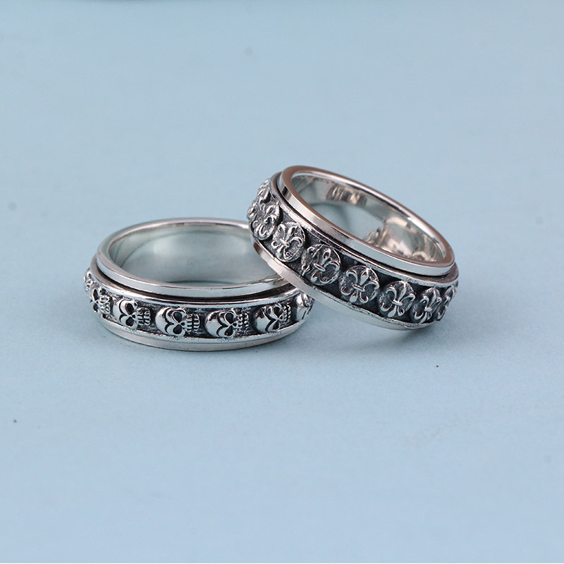 转运戒指 s925纯银男女情侣指环复古泰银饰十字架骷髅头转动戒指