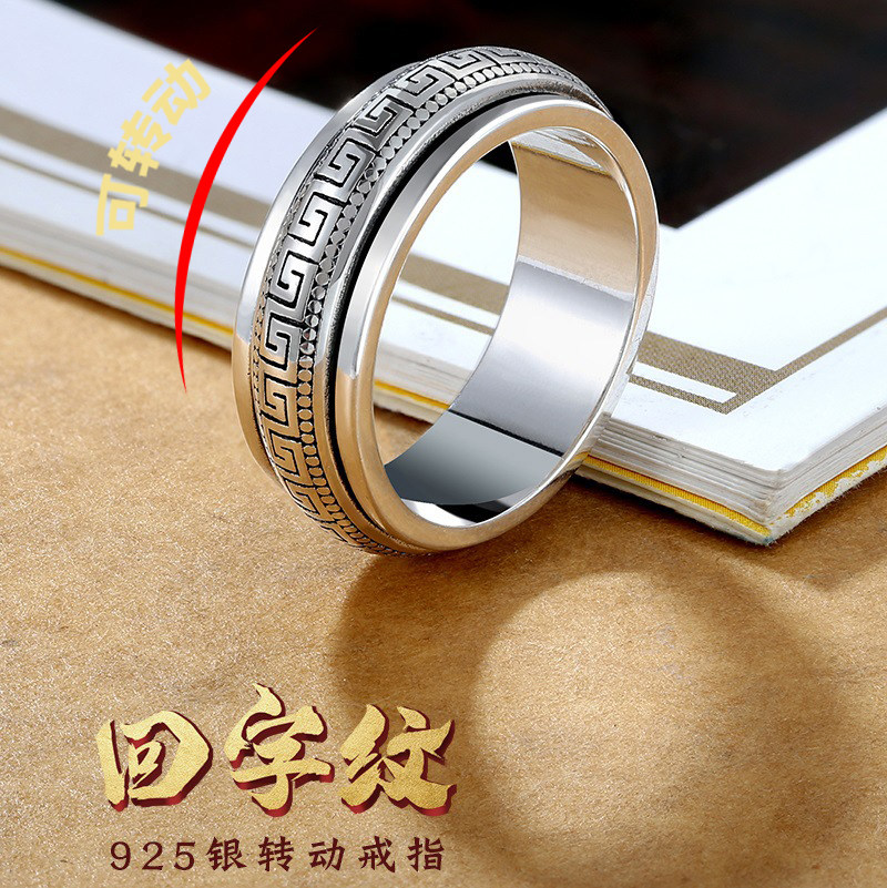 纯银回纹转运戒指男士转动单身戒个性复古简约旋转尾戒潮人食指环