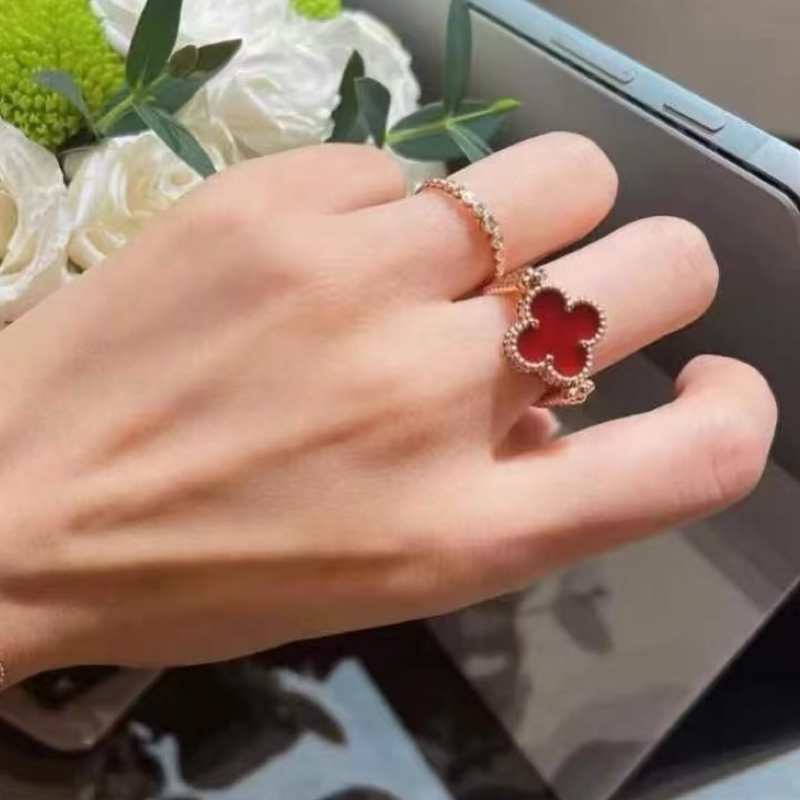 高定品质彩金镭射红玉髓四叶草翻转运戒指18K双花双面玫瑰金戒指
