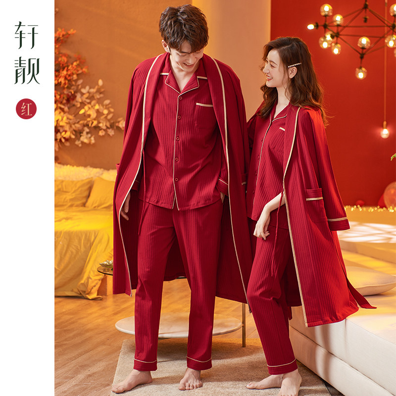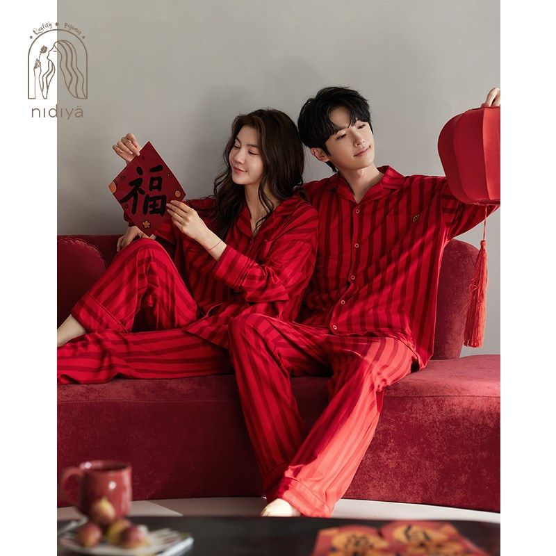 妮狄娅婚庆睡衣秋季女柔软棉长袖男开衫红色本命年春秋家居服套装