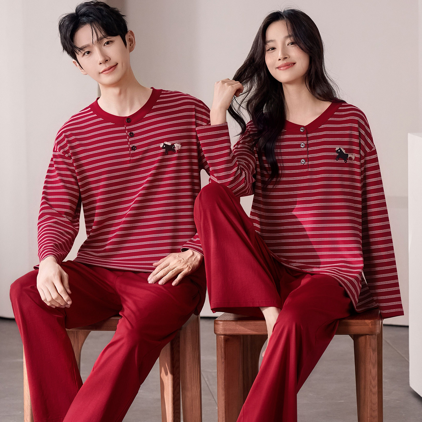 Gukoo/果壳睡衣情侣春秋款爱丽丝红色家居服结婚条纹婚庆女套装C