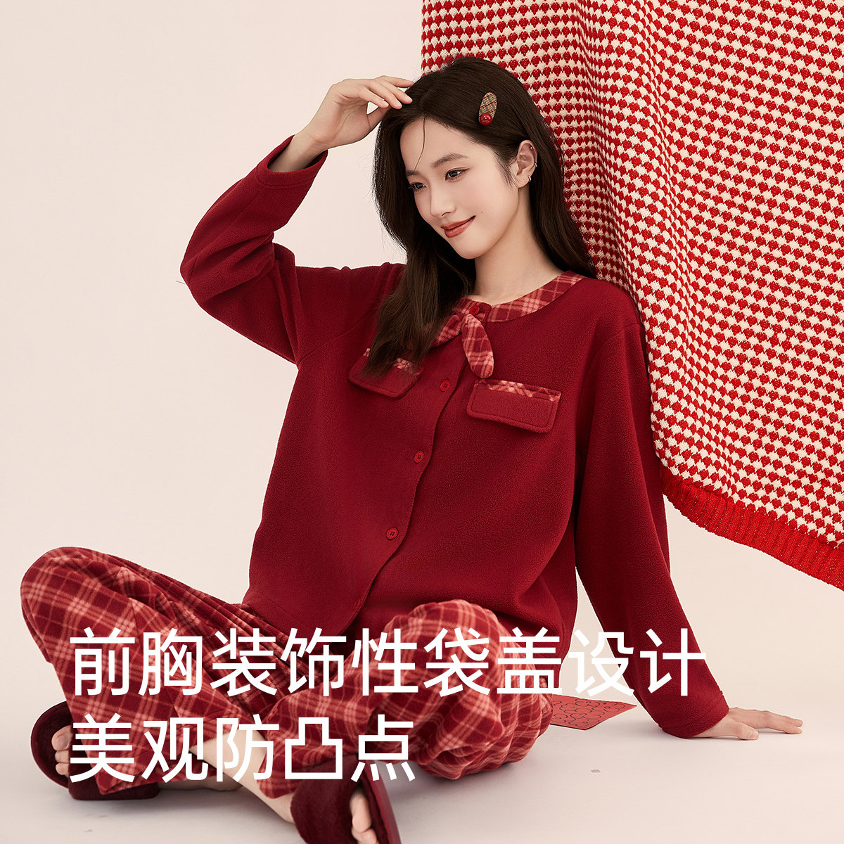 顶瓜瓜摇粒绒睡衣女秋冬季圆领开襟本命年红色婚庆家居服套装外穿