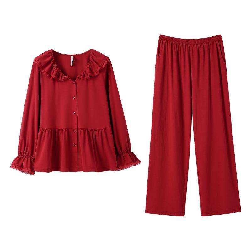 歌瑞尔可外穿婚庆棉睡衣女款2025年秋荷叶边本命年红色家居服套装