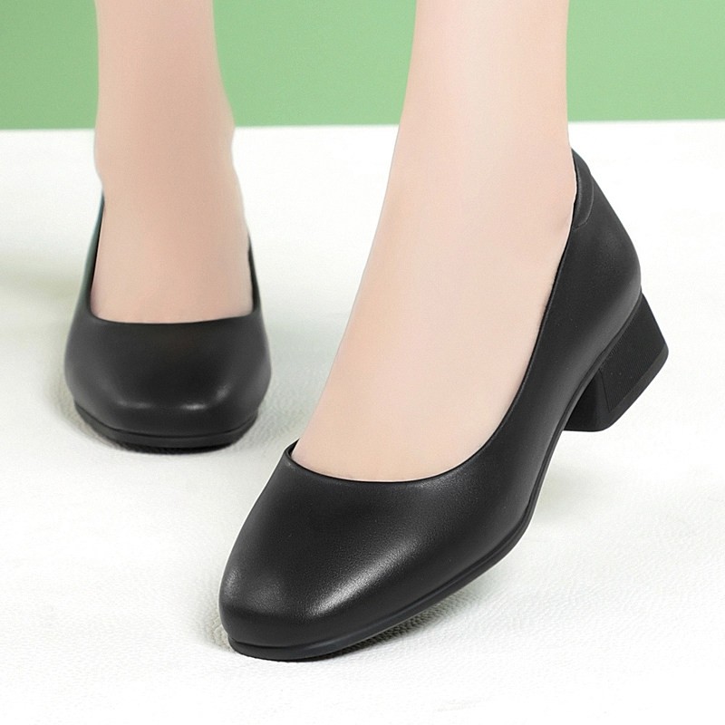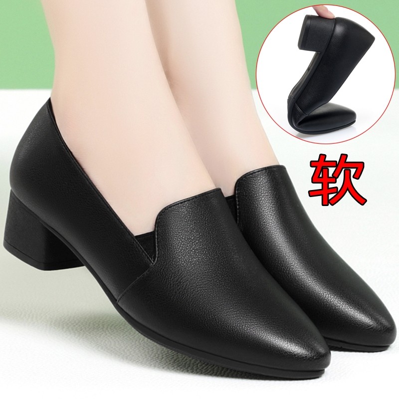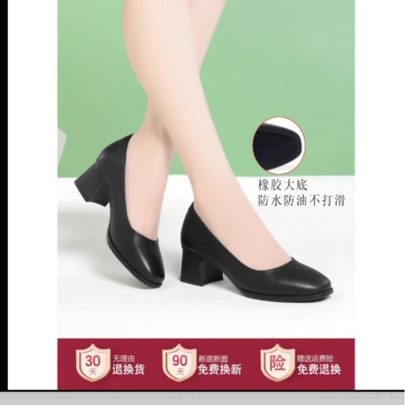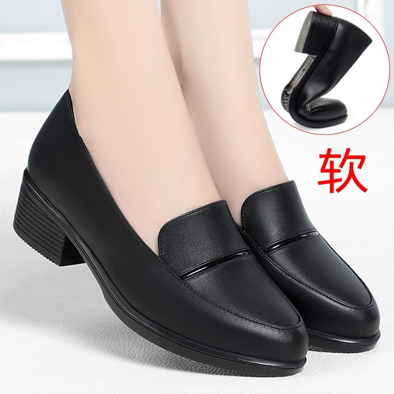 真皮工作鞋女软底舒适不累脚上班工鞋黑色牛皮鞋全皮职业粗跟女鞋